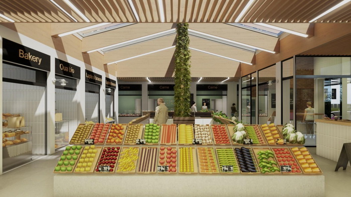 Interiorul pieței este proiectat astfel încât să se păstreze o comunicare continuă între spațiile interioare și zona publică exterioară. Astfel, suprafețele deschise, marcate prin vitraje generoase, sunt prevăzute către zona de acces.