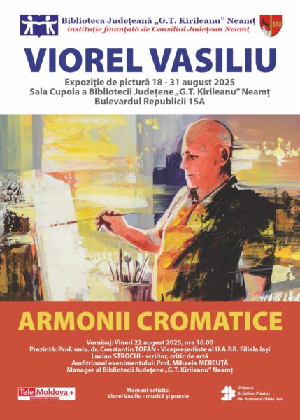 Biblioteca Județeană „G.T. Kirileanu“ Neamț găzduiește expoziția de pictură „Armonii cromatice“ a plasticianului ieșean Viorel Vasiliu, în Sala Cupola, în perioada 18-31 august 2025.
