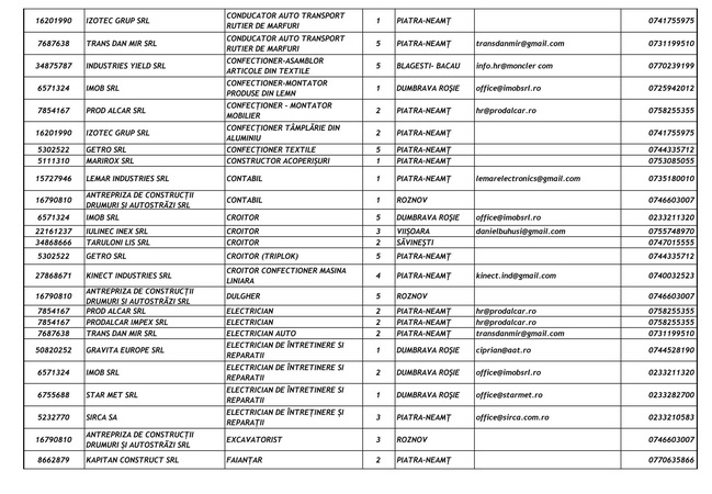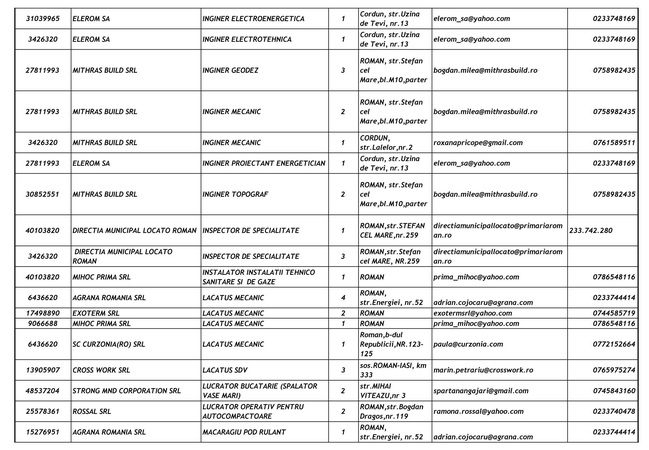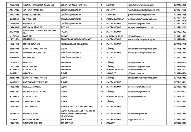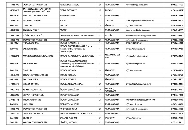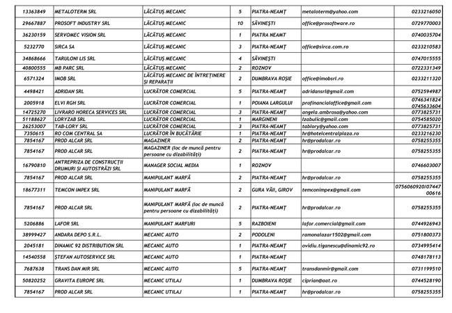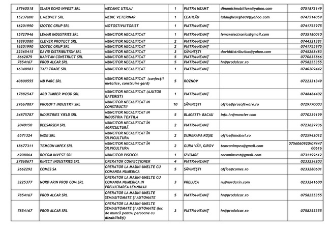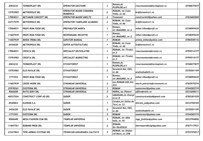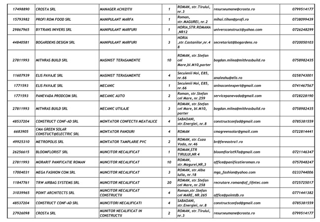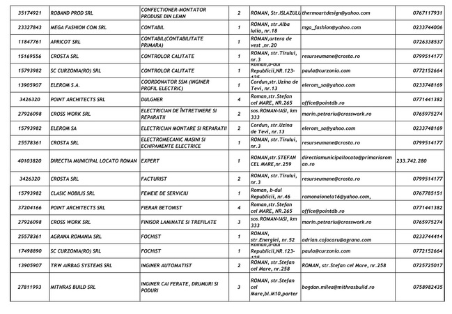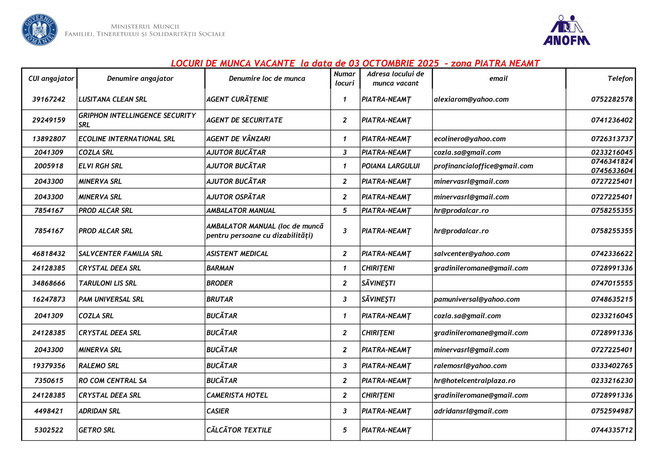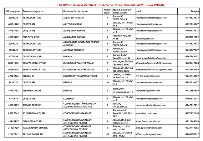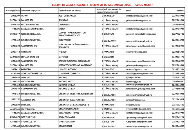 Lista locurilor de muncă – 3 octobrie 2025 Mircea Albu October 4, 2025 Post Views: 1,596 Continue Reading Previous: Jandarmeria Neamț dă startul recrutărilor pentru o carieră militară:700 de locuri disponibile în Școlile de SubofițeriNext: Bărbat din Roman, reținut după ce a încălcat ordinul de protecție Leave a Reply Cancel replyYour email address will not be published. Required fields are marked *Comment * Name * Email * Website Save my name, email, and website in this browser for the next time I comment. Δ Related Stories Tentativă de mită în trafic Tentativă de mită în trafic April 20, 2026 Lista locurilor de muncă vacante la data de 17 aprilie 2026 Lista locurilor de muncă vacante la data de 17 aprilie 2026 April 17, 2026 Programul Serviciului Stare Civilă în perioada Sărbătorilor de Paște Programul Serviciului Stare Civilă în perioada Sărbătorilor de Paște April 9, 2026
