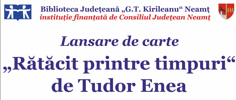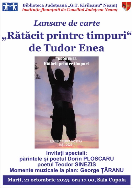 Biblioteca Județeană găzduiește lansarea cărții „Rătăcit printre timpuri“ de Tudor Enea, marți, 21 octombrie, de la ora 17:00, în Sala Cupola. Prezentarea va fi făcută de poetul Teodor Sinezis și de părintele și poetul Dorin Ploscaru, coordonatorul Reprezentanței Neamț a Uniunii Scriitorilor din România, Filiala Iași. Evenimentul va fi întregit cu momente muzicale interpretate la pian de George Țăranu.