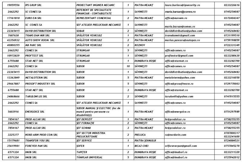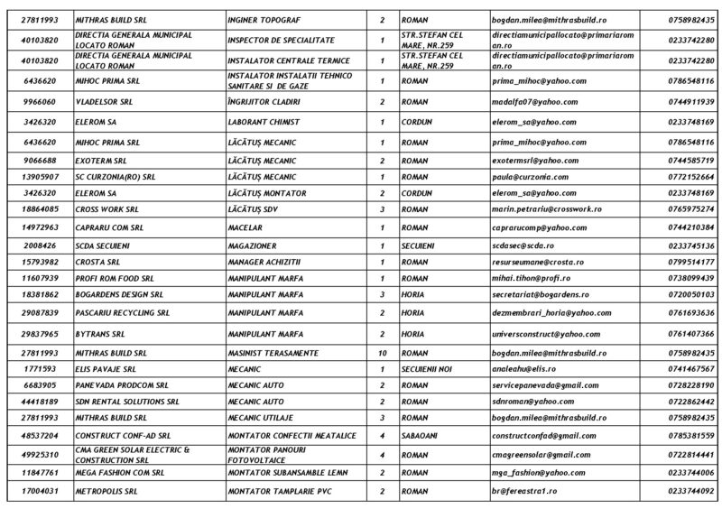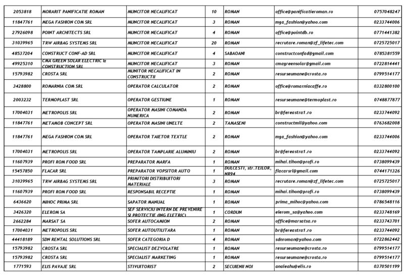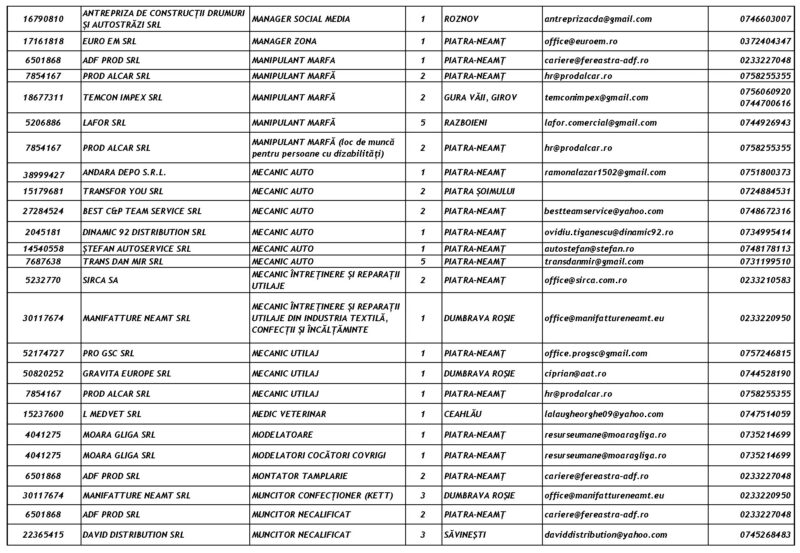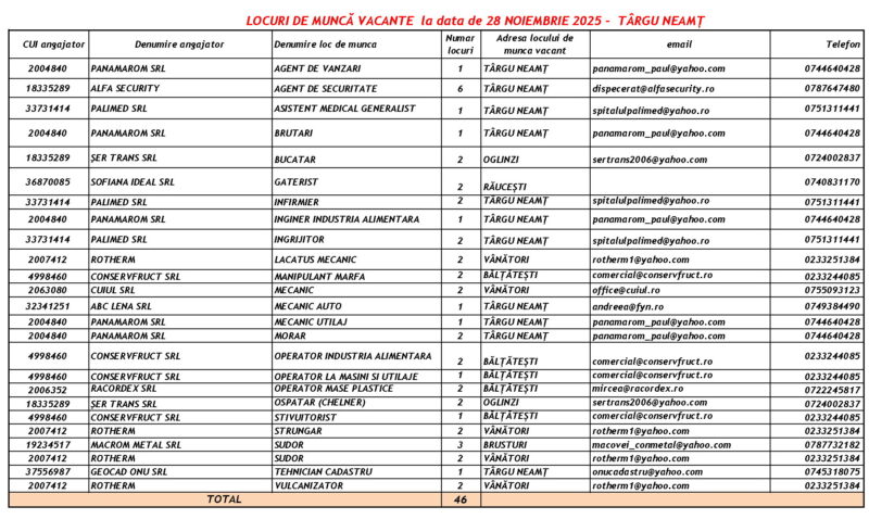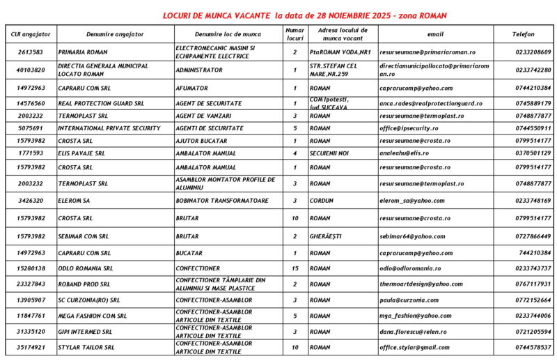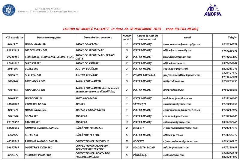 Lista locurilor de muncă – 28 Noiembrie 2025 Mircea Albu November 29, 2025 Post Views: 102 Continue Reading Previous: Duminică, 30 noiembrie, marea deschidere a Târgului „Piatra lui Crăciun”Next: Măsuri de siguranță pentru minivacanța de Sfântul Andrei și Ziua Națională: Polițiștii, jandarmii și pompierii, la datorie Leave a Reply Cancel replyYour email address will not be published. Required fields are marked *Comment * Name * Email * Website Save my name, email, and website in this browser for the next time I comment. Δ Related Stories Tentativă de mită în trafic Tentativă de mită în trafic April 20, 2026 Lista locurilor de muncă vacante la data de 17 aprilie 2026 Lista locurilor de muncă vacante la data de 17 aprilie 2026 April 17, 2026 Programul Serviciului Stare Civilă în perioada Sărbătorilor de Paște Programul Serviciului Stare Civilă în perioada Sărbătorilor de Paște April 9, 2026