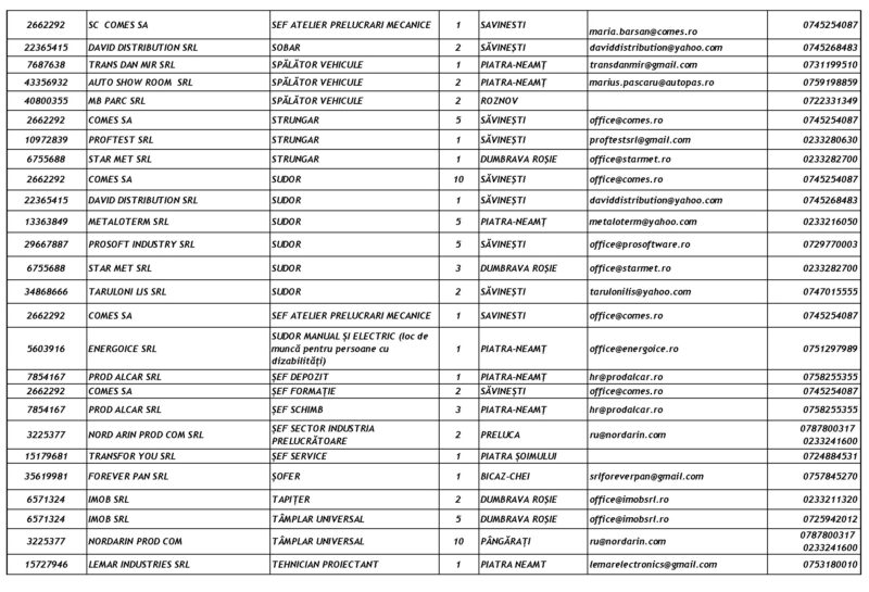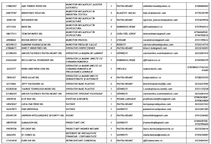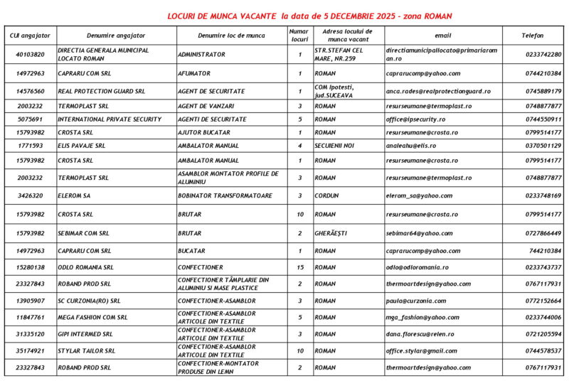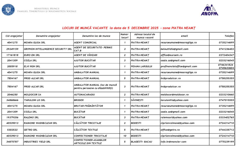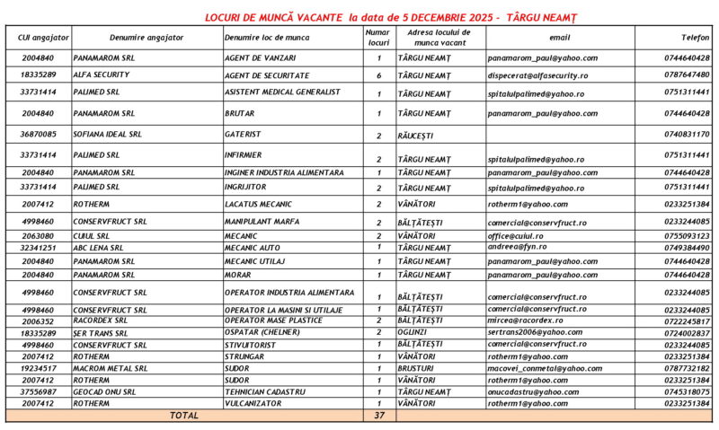 Lista locurilor de muncă vacante – 5 Decembrie 2025 Mircea Albu December 6, 2025 Post Views: 526 Continue Reading Previous: „Sus, la poarta Cerului“, spectacol de colinde la Biblioteca JudețeanăNext: Accident grav în Târgu-Neamț Leave a Reply Cancel replyYour email address will not be published. Required fields are marked *Comment * Name * Email * Website Save my name, email, and website in this browser for the next time I comment. Δ Related Stories Tentativă de mită în trafic Tentativă de mită în trafic April 20, 2026 Lista locurilor de muncă vacante la data de 17 aprilie 2026 Lista locurilor de muncă vacante la data de 17 aprilie 2026 April 17, 2026 Programul Serviciului Stare Civilă în perioada Sărbătorilor de Paște Programul Serviciului Stare Civilă în perioada Sărbătorilor de Paște April 9, 2026