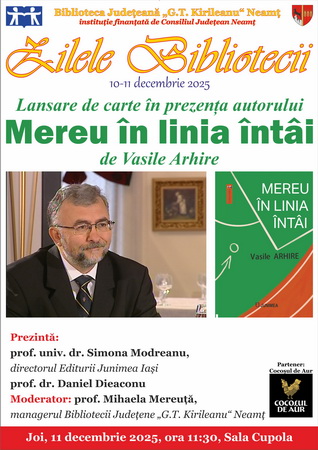A doua dintre Zilele Bibliotecii va avea două evenimente principale în aceeași Sală Cupola. De la ora 11:30 va fi lansată cartea ,,Mereu în linia întâi“ a luiVasile Arhire, care va fi prezentată deprof.univ.dr. Simona Modreanu, directorul Editurii Junimea, și de prof. dr. Daniel Dieaconu, cu moderarea prof. Mihaela Mereuță, managerul Bibliotecii Județeane ,,G.T. Kirileanu“ Neamț.