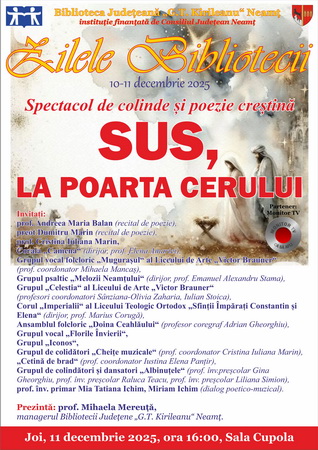 De la ora 16:00, se va derula spectacolul de colinde și poezie creștină ,,Sus, la poarta Cerului“, cu invitații prof. Andreea Maria Balan (recital de poezie), preot Dumitru Marin (recital de poezie), prof. Cristina Iuliana Marin, Corala „Camena“ (dirijor: prof. Elena Amariei), Grupul „Iconos“, Grupul vocal folcloric „Mugurașul“ al Liceului de Arte „Victor Brauner“ (profesor coordonator: Mihaela Mancaș), Grupul psaltic „Melozii Neamțului“ (dirijor: prof. Emanuel Alexandru Stama), Grupul „Celestia“ al Liceului de Arte „Victor Brauner“ (profesori coordonatori: Sânziana-Olivia Zaharia, Iulian Stoica), Corul „Imperialii“ al Liceului Teologic Ortodox „Sfinții Împărați Constantin și Elena“ (dirijor: prof. Marius Corugă), Ansamblul folcloric „Doina Ceahlăului“ (profesor coregraf: Adrian Gheorghiu), Grupul vocal „Florile Învierii“, Grupul de colindători „Cheițe muzicale“ (profesor coordonator: Cristina Iuliana Marin), „Cetină de brad“ (profesor coordonator: Iustina Elena Panțir), Grupul de colindători și dansatori „Albinuțele“ (profesor învățământ preșcolar Gina Gheorghiu, profesor învățământ preșcolar Raluca Teacu, profesor învățământ preșcolar Liliana Simion), și profesor învățământ primar Mia Tatiana Ichim și Miriam Ichim, într-un dialog poetico-muzical.