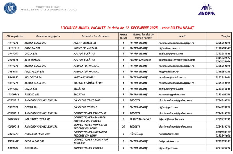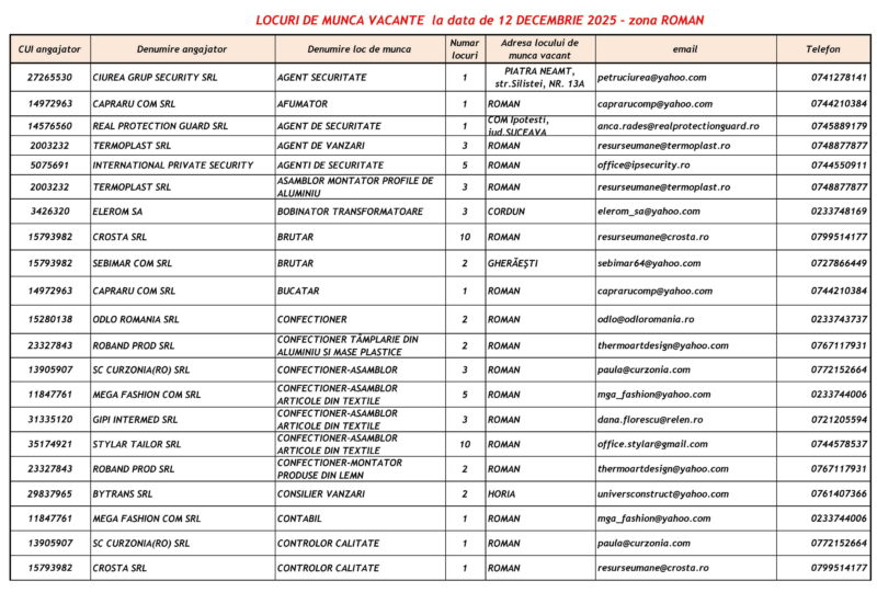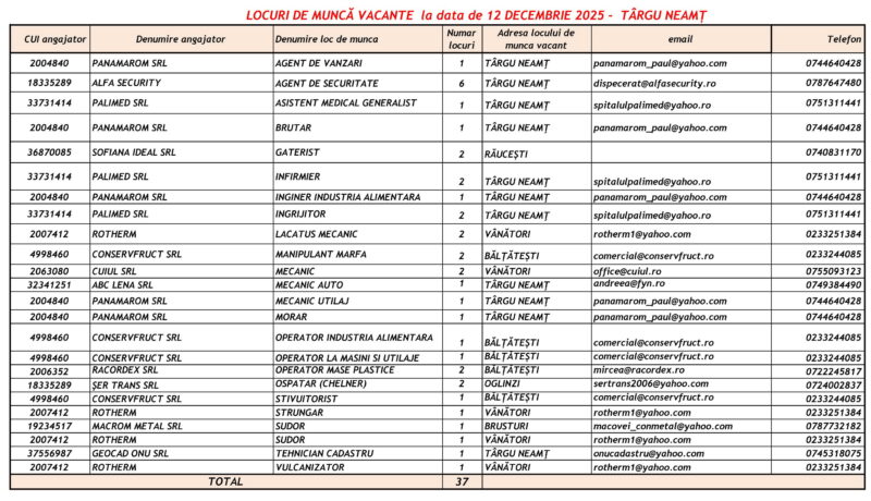 Lista locurilor de muncă vacante – 12 Decembrie 2025 Mircea Albu December 14, 2025 Post Views: 690 Continue Reading Previous: Expoziție de păpuși, la Biblioteca JudețeanăNext: „Sfântă noapte de Crăciun“ cu Daniel Ovidiu Stelescu, la Biblioteca Județeană Leave a Reply Cancel replyYour email address will not be published. Required fields are marked *Comment * Name * Email * Website Save my name, email, and website in this browser for the next time I comment. Δ Related Stories Tentativă de mită în trafic Tentativă de mită în trafic April 20, 2026 Lista locurilor de muncă vacante la data de 17 aprilie 2026 Lista locurilor de muncă vacante la data de 17 aprilie 2026 April 17, 2026 Programul Serviciului Stare Civilă în perioada Sărbătorilor de Paște Programul Serviciului Stare Civilă în perioada Sărbătorilor de Paște April 9, 2026