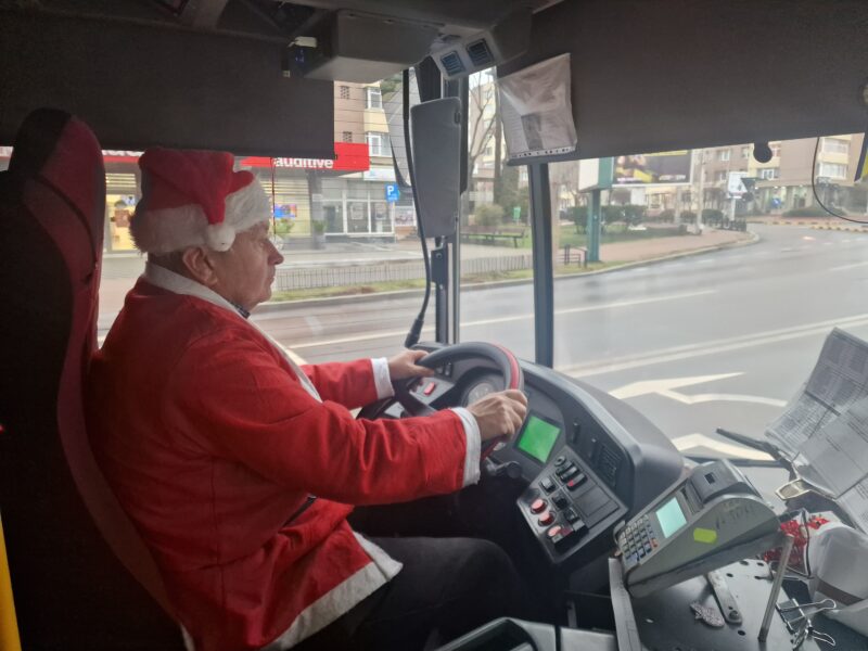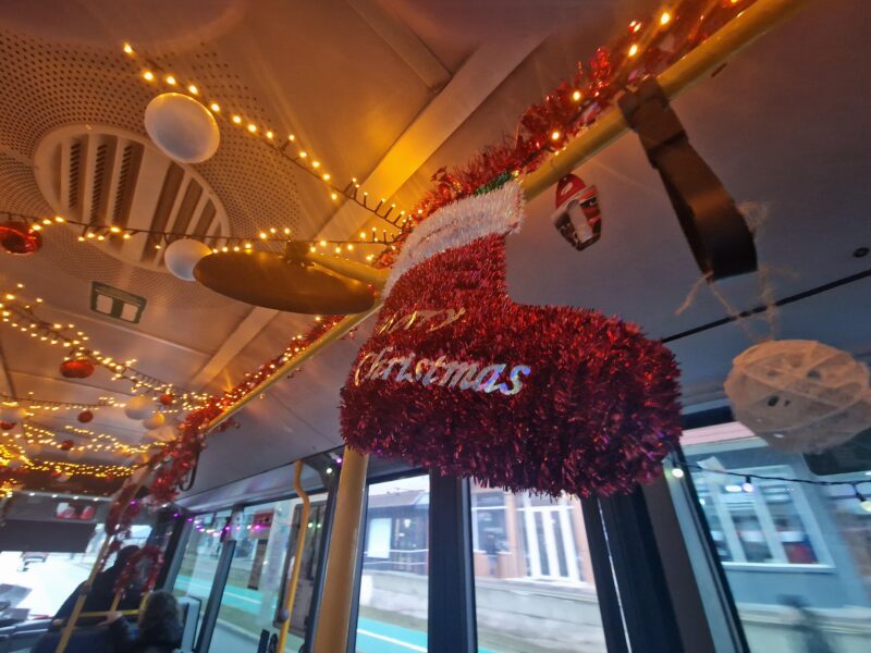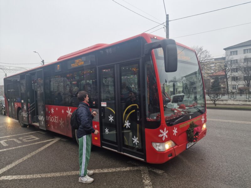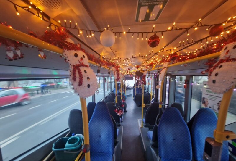 Instalații luminoase, ghirlande și decorațiuni tematice împodobesc barele și spațiile interioare ale autobuzului, creând o atmosferă caldă și festivă. Din difuzoare se aud, discret, colinde, iar surpriza cea mai mare îi așteaptă pe pasageri chiar la volan: șoferul este îmbrăcat în Moș Crăciun, cu costum roșu și multă voie bună.