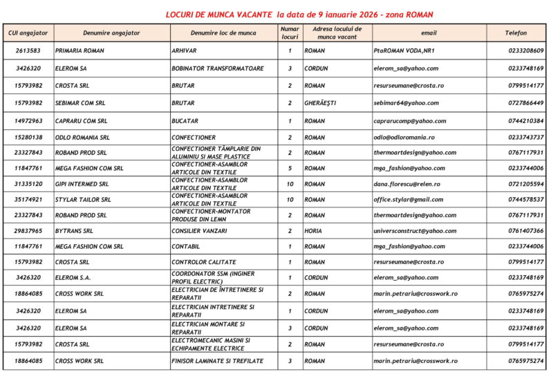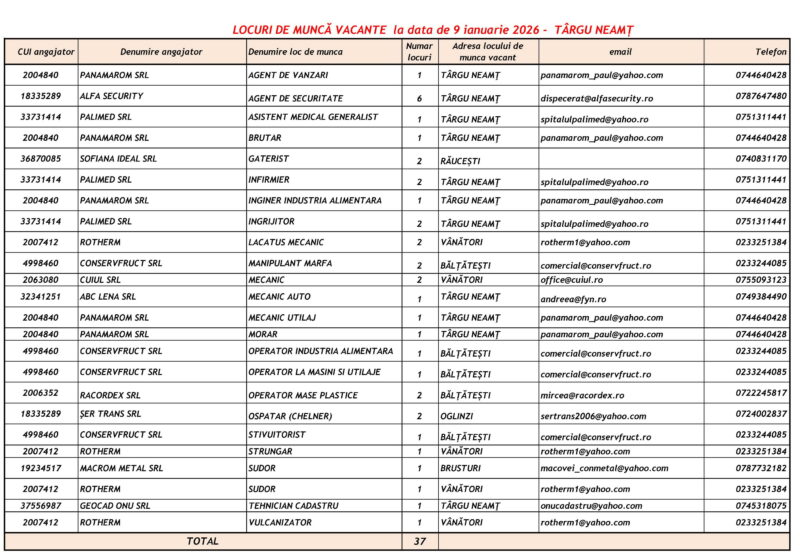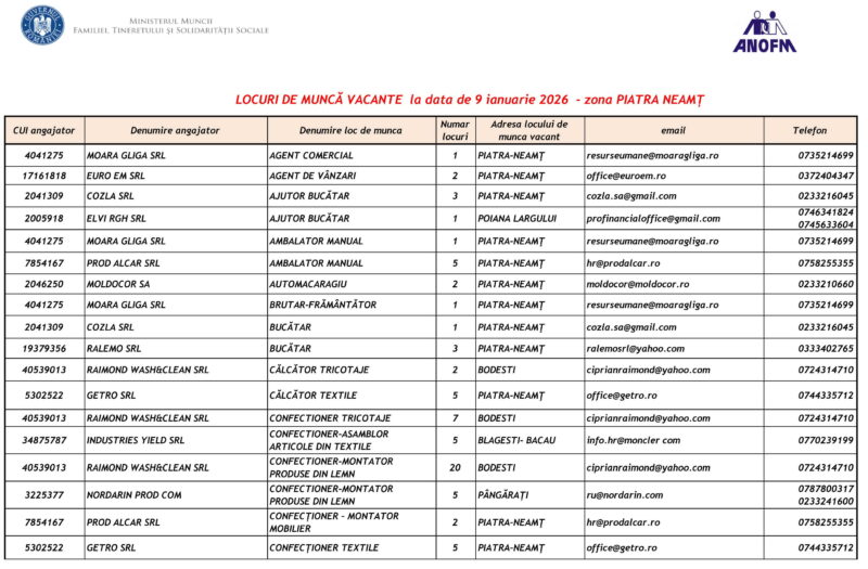 Lista locurilor de muncă vacante la data de 9 Ianuarie 2026 Mircea Albu January 9, 2026 Post Views: 327 Continue Reading Previous: Circulație în condiții de iarnă pe drumurile județene din NeamțNext: Accident rutier în afara localității Nisiporești Leave a Reply Cancel replyYour email address will not be published. Required fields are marked *Comment * Name * Email * Website Save my name, email, and website in this browser for the next time I comment. Δ Related Stories Tentativă de mită în trafic Tentativă de mită în trafic April 20, 2026 Lista locurilor de muncă vacante la data de 17 aprilie 2026 Lista locurilor de muncă vacante la data de 17 aprilie 2026 April 17, 2026 Programul Serviciului Stare Civilă în perioada Sărbătorilor de Paște Programul Serviciului Stare Civilă în perioada Sărbătorilor de Paște April 9, 2026