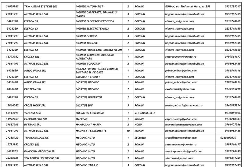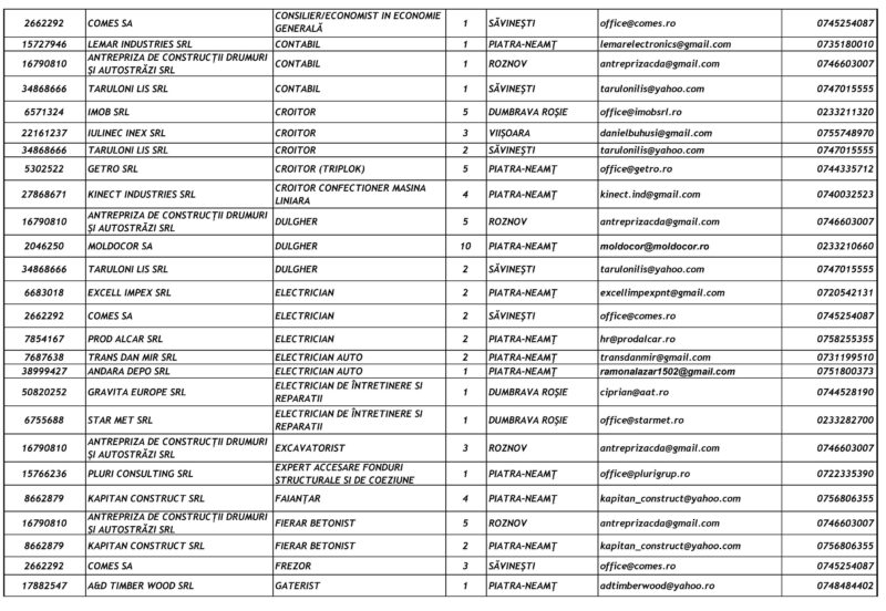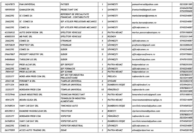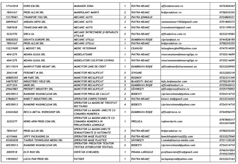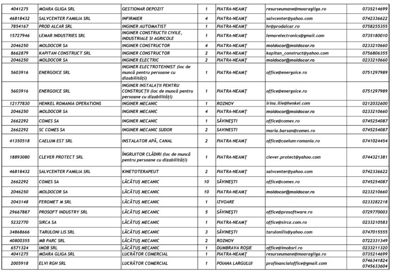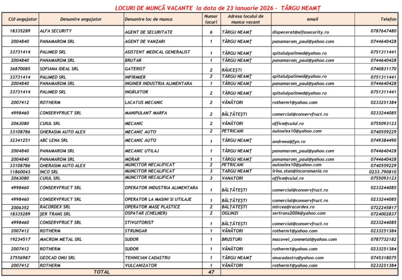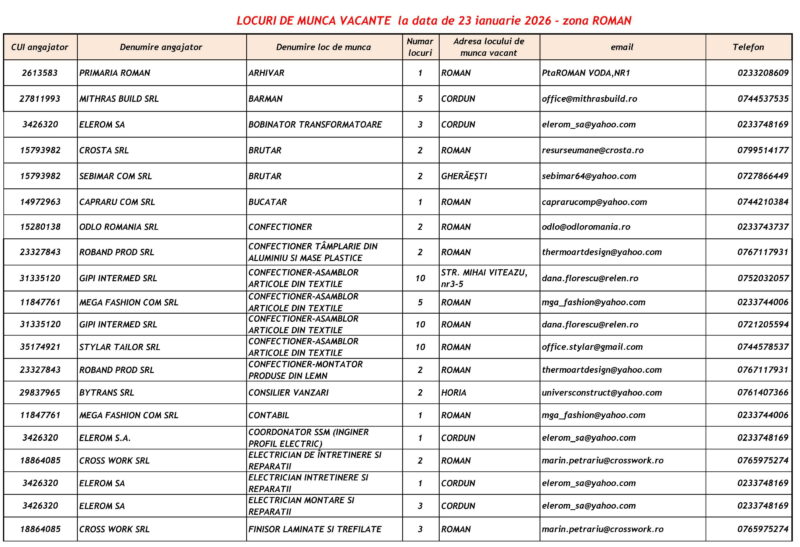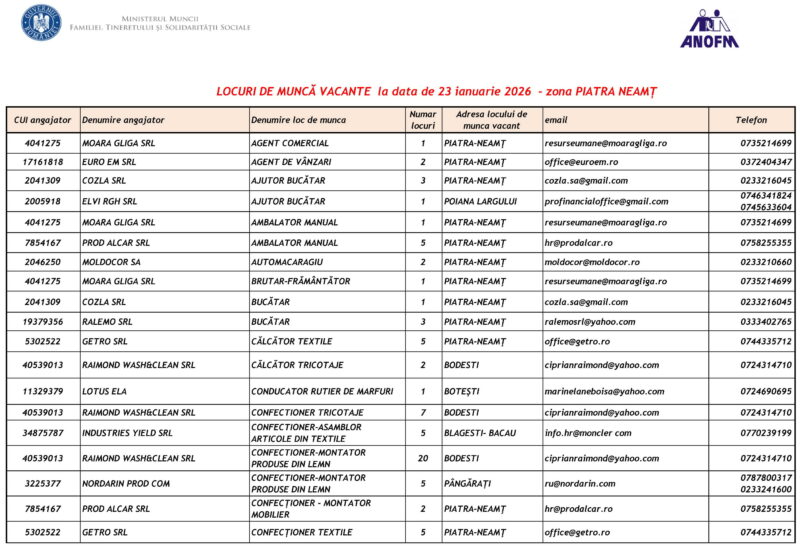 Lista locurilor de muncă vacante – 23 Ianuarie 2026 Mircea Albu January 23, 2026 Post Views: 51 Continue Reading Previous: Pietrenii, invitați să se prindă în Hora Unirii la Curtea Domnească, pe 24 ianuarieNext: Unirea Principatelor Române, sărbătorită la Piatra-Neamț Leave a Reply Cancel replyYour email address will not be published. Required fields are marked *Comment * Name * Email * Website Save my name, email, and website in this browser for the next time I comment. Δ Related Stories Tentativă de mită în trafic Tentativă de mită în trafic April 20, 2026 Lista locurilor de muncă vacante la data de 17 aprilie 2026 Lista locurilor de muncă vacante la data de 17 aprilie 2026 April 17, 2026 Programul Serviciului Stare Civilă în perioada Sărbătorilor de Paște Programul Serviciului Stare Civilă în perioada Sărbătorilor de Paște April 9, 2026
