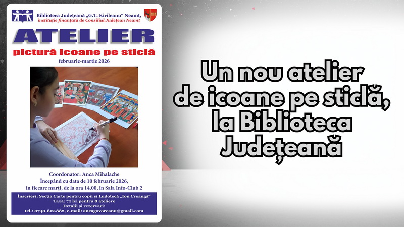 Biblioteca Județeană „G.T. Kirileanu“ Neamț organizează, în perioada februarie-martie 2026, un nou atelier de pictură pe sticlă dedicat copiilor și coordonat de Anca Mihalache, bibliotecar la Secția Carte pentru copii și Ludotecă „Ion Creangă“. Sunt disponibile 15 locuri.