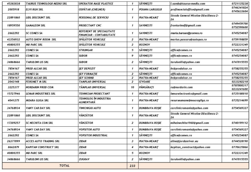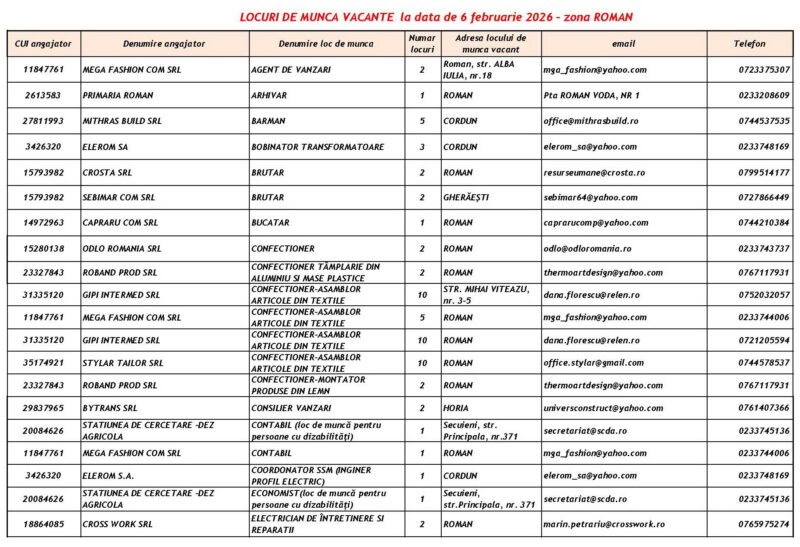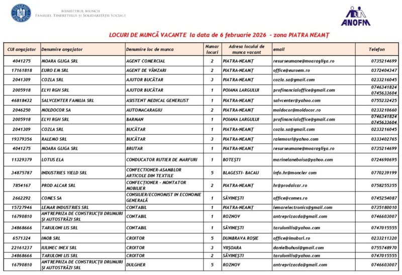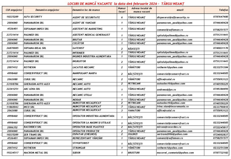 Lista locurilor de muncă vacante la data de 6 februarie 2026 Mircea Albu February 9, 2026 Post Views: 876 Continue Reading Previous: Județul Neamț își consolidează vizibilitatea pe harta turismului românescNext: Accident feroviar la Secuieni Leave a Reply Cancel replyYour email address will not be published. Required fields are marked *Comment * Name * Email * Website Save my name, email, and website in this browser for the next time I comment. Δ Related Stories Tentativă de mită în trafic Tentativă de mită în trafic April 20, 2026 Lista locurilor de muncă vacante la data de 17 aprilie 2026 Lista locurilor de muncă vacante la data de 17 aprilie 2026 April 17, 2026 Programul Serviciului Stare Civilă în perioada Sărbătorilor de Paște Programul Serviciului Stare Civilă în perioada Sărbătorilor de Paște April 9, 2026