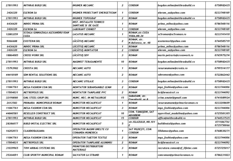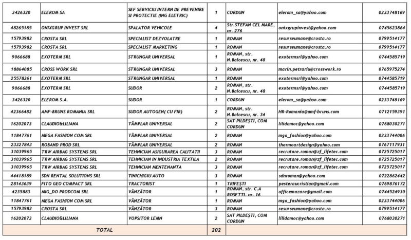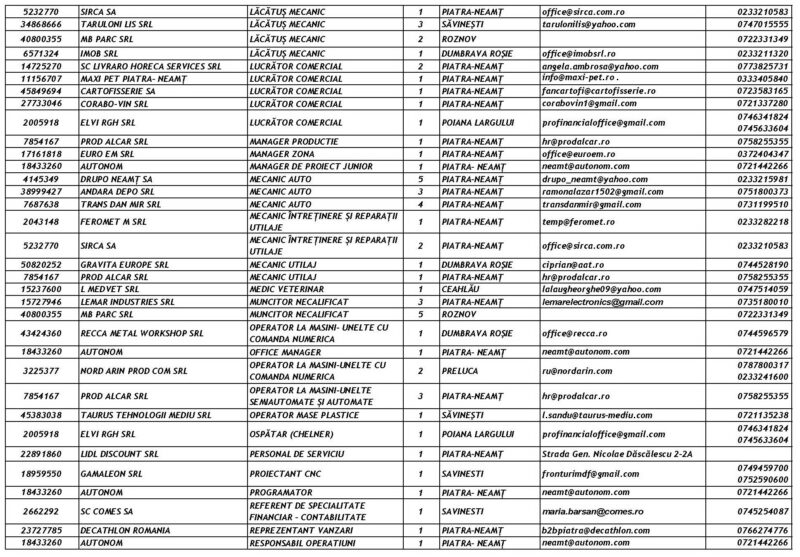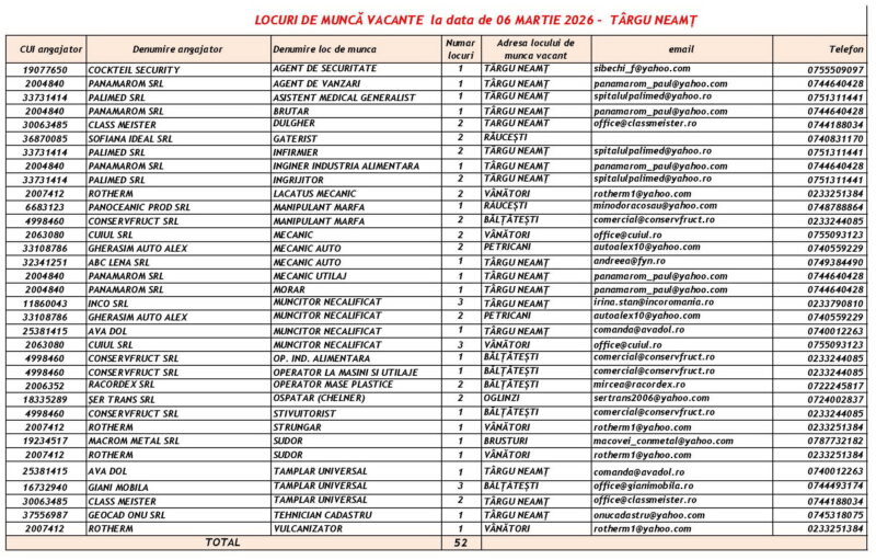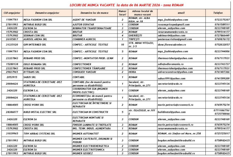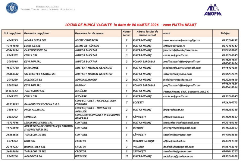 Lista locurilor de muncă vacante la data de 6 Martie 2026 Mircea Albu March 6, 2026 476 locuri de munca vacante anuntate de agentii economici pentru saptamana 06.03-13.03. 2026. Post Views: 708 Continue Reading Previous: Piatra-Neamț devine capitala performanței în ITNext: La Mulți Ani femeilor care dau sens comunității noastre! Leave a Reply Cancel replyYour email address will not be published. Required fields are marked *Comment * Name * Email * Website Save my name, email, and website in this browser for the next time I comment. Δ Related Stories Tentativă de mită în trafic Tentativă de mită în trafic April 20, 2026 Lista locurilor de muncă vacante la data de 17 aprilie 2026 Lista locurilor de muncă vacante la data de 17 aprilie 2026 April 17, 2026 Programul Serviciului Stare Civilă în perioada Sărbătorilor de Paște Programul Serviciului Stare Civilă în perioada Sărbătorilor de Paște April 9, 2026