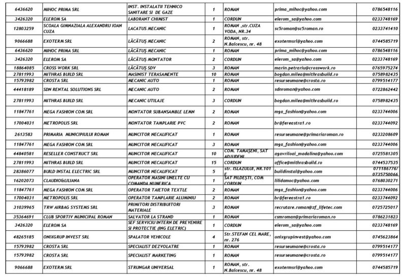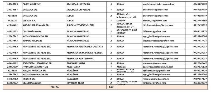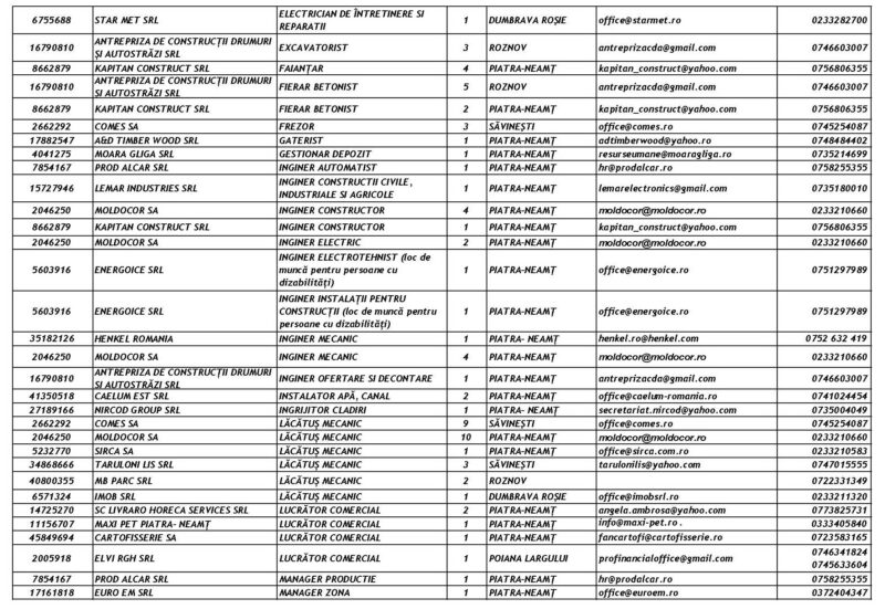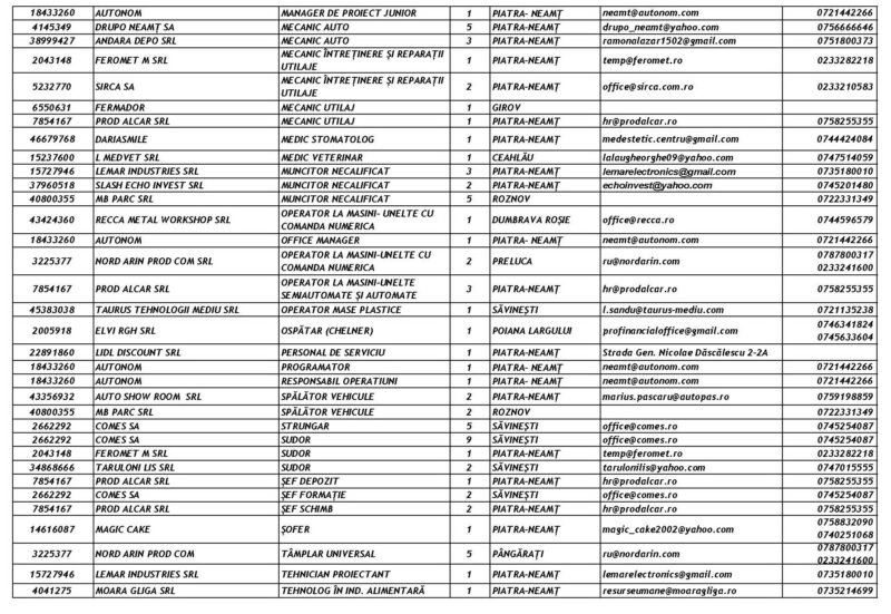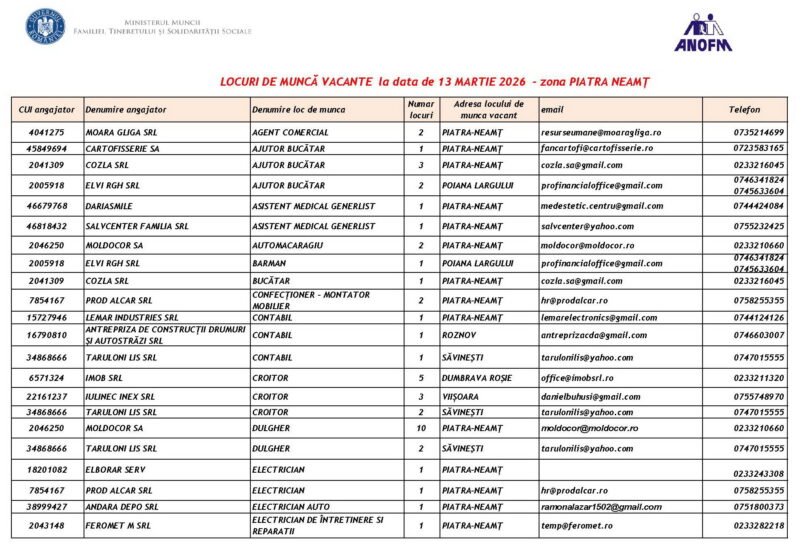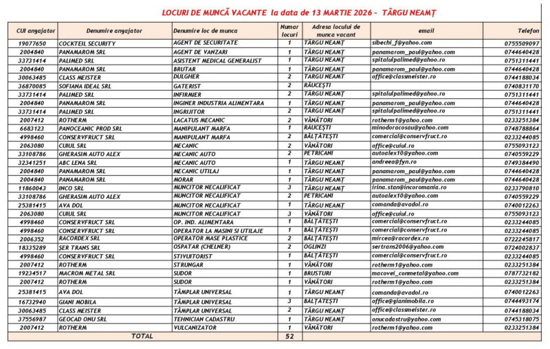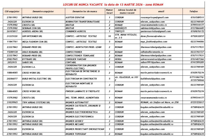 Lista locurilor de muncă vacante la data de 13 Martie 2026 Mircea Albu March 13, 2026 439 locuri de munca vacante anuntate de agentii economici pentru saptamana 13.03-20.03 2026 Post Views: 585 Continue Reading Previous: Misiune de căutare-salvare în Piatra-Neamț: Un tânăr de 18 ani, dispărut în canalul de fugă al râului BistrițaNext: Grințieș: Cinci ore de luptă cu flăcările pe un teren accidentat Leave a Reply Cancel replyYour email address will not be published. Required fields are marked *Comment * Name * Email * Website Save my name, email, and website in this browser for the next time I comment. Δ Related Stories Accident rutier în această dimineață în Roman Accident rutier în această dimineață în Roman April 20, 2026 Peste 100 de Intervenții în Perioada 17-19 Aprilie 2026 Peste 100 de Intervenții în Perioada 17-19 Aprilie 2026 April 20, 2026 Autoutilitară cuprinsă de flăcări în Piatra-Neamț Autoutilitară cuprinsă de flăcări în Piatra-Neamț April 16, 2026
