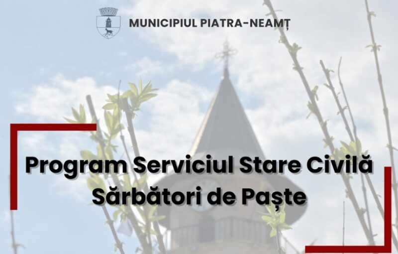 Programul Serviciului Stare Civilă în perioada Sărbătorilor de Paște Mircea Albu April 9, 2026 👉 Vineri, 10.04.2026 – LIBER Înregistrări decese 👉 Sâmbătă, 11.04.2026 – 09:00 – 13:00👉 Duminică, 12.04.2026 – LIBER👉 Luni, 13.04.2026 – LIBER Post Views: 128 Continue Reading Previous: Doliu în fotbalul românesc: Mircea Lucescu s-a stins din viațăNext: Caravana Iepurașului ajunge în Parcul Central din Piatra-Neamț Leave a Reply Cancel replyYour email address will not be published. Required fields are marked *Comment * Name * Email * Website Save my name, email, and website in this browser for the next time I comment. Δ Related Stories Tentativă de mită în trafic Tentativă de mită în trafic April 20, 2026 Lista locurilor de muncă vacante la data de 17 aprilie 2026 Lista locurilor de muncă vacante la data de 17 aprilie 2026 April 17, 2026 Bărbat reținut după ce ar fi încălcat un ordin de protecție și ar fi provocat distrugeri în Petricani Bărbat reținut după ce ar fi încălcat un ordin de protecție și ar fi provocat distrugeri în Petricani April 6, 2026