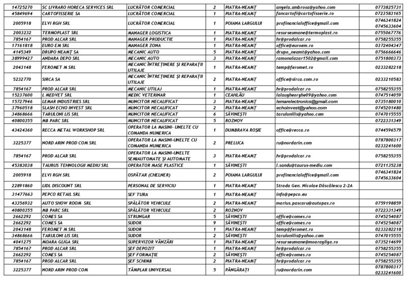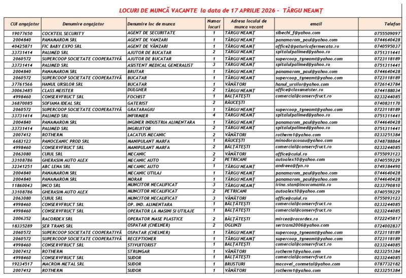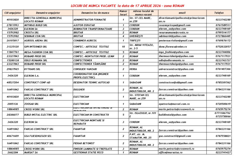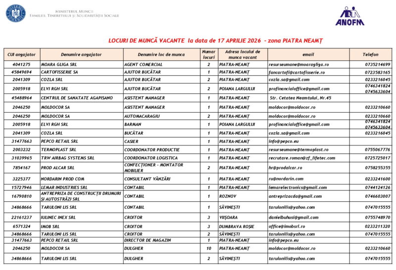 Lista locurilor de muncă vacante la data de 17 aprilie 2026 Mircea Albu April 17, 2026 Post Views: 854 Continue Reading Previous: Expoziția de pictură a profesorului Macavei, la Biblioteca JudețeanăNext: Peste 100 de Intervenții în Perioada 17-19 Aprilie 2026 Leave a Reply Cancel replyYour email address will not be published. Required fields are marked *Comment * Name * Email * Website Save my name, email, and website in this browser for the next time I comment. Δ Related Stories Tentativă de mită în trafic Tentativă de mită în trafic April 20, 2026 Programul Serviciului Stare Civilă în perioada Sărbătorilor de Paște Programul Serviciului Stare Civilă în perioada Sărbătorilor de Paște April 9, 2026 Bărbat reținut după ce ar fi încălcat un ordin de protecție și ar fi provocat distrugeri în Petricani Bărbat reținut după ce ar fi încălcat un ordin de protecție și ar fi provocat distrugeri în Petricani April 6, 2026